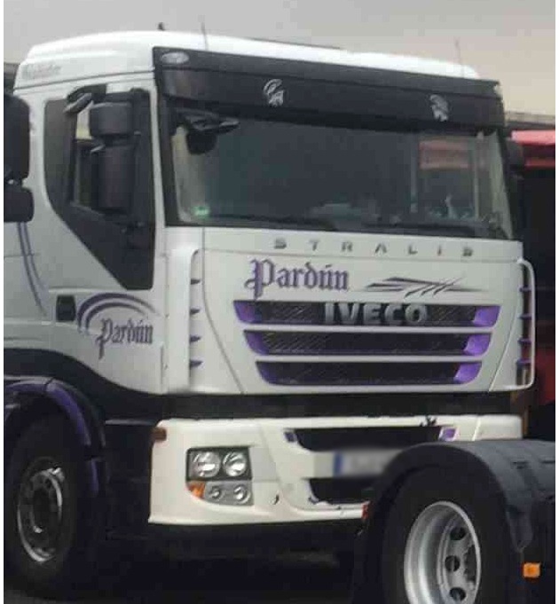 Bei der Fahrzeugkombination handelt es sich um eine weiße Zugmaschine der Marke IVECO mit lila Ornamenten und einem schwarz/roten Auflieger (siehe Fotos).