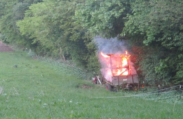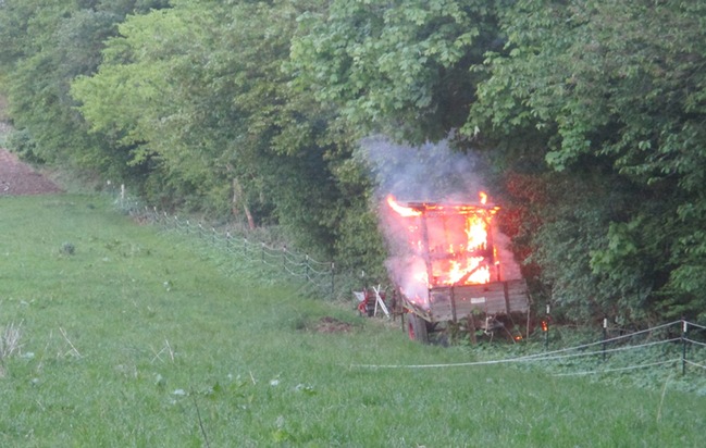 Eine Zeugin sah gegen 20:10 Uhr, wie es auf einer Wiese qualmte. Bei näherer Betrachtung stellte sie fest, dass ein Hochsitz, der auf einem Anhänger montiert war, in Flammen stand. Einsatzkräfte der Feuerwehr löschten das Feuer. Die Polizei hat Ermittlungen zur Brandursache aufgenommen. Laut Zeugenangaben hielten sich während des Brandes drei Jugendliche zwischen 18 und 20 Jahren in unmittelbarer Nähe zum Hochsitz auf. Sie seien dunkel gekleidet und schlank gewesen. Die Polizei bittet diese Personen, sich umgehend bei einer Polizeidienststelle oder unter der Rufnummer 02233 52-0 zu melden. Zeugenhinweise nehmen die Ermittler des Kriminalkommissariats 21 ebenfalls unter dieser Nummer entgegen. (nh)