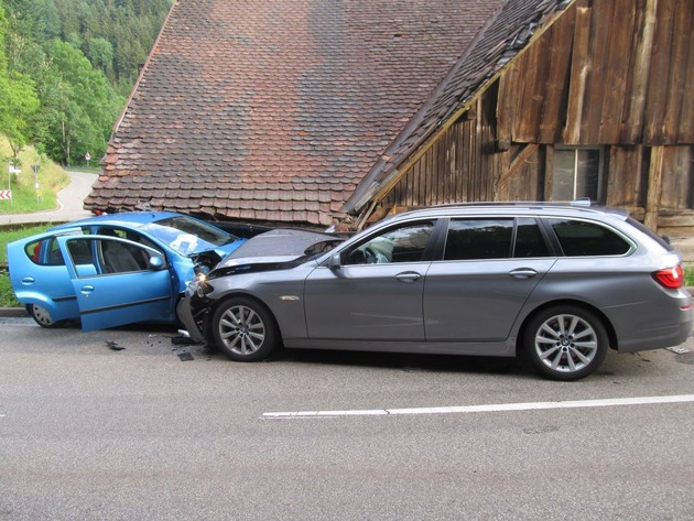 Am Montag, gegen 19.15 Uhr, befuhr eine Autofahrerin mit ihrem Kleinwagen die Landstraße in Obersimonswald in Richtung Gütenbach. Unmittelbar nach einer scharfen Linkskurve (sogenannte "Sternenkurve") kam sie aus noch nicht geklärter Ursache komplett auf die Gegenfahrbahn und stieß dort frontal mit einem entgegenkommenden BMW zusammen. Ein hinter dem BMW fahrender weiterer Pkw-Fahrer bemerkte die Situation zu spät und fuhr auf diesen auf. Die Unfallverursacherin wurde bei der Kollision verletzt. Sie wurde an Ort und Stelle ärztlich versorgt und anschließend in ein Krankenhaus gefahren. Durch den Unfall wurde auch ein altes Gebäude am Straßenrand in Mitleidenschaft gezogen. Den Sachschaden schätzt die Polizei vorsichtig auf mehrere Zehntausend Euro.