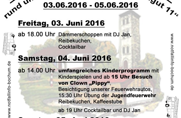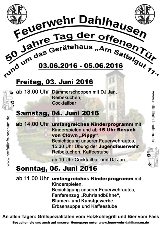 Die Freiwillige Feuerwehr Bochum-Dahlhausen veranstaltet vom 3.Juni bis zum 5. Juni 2016 wieder ihr jährlich stattfindendes Feuerwehrfest. In diesem Jahr sind die Kollegen der Freiweilligen Feuerwehr besonders stolz auf das Fest, denn es findet zum 50. Mal ununterbrochen seit 1966 statt. Veranstaltet wird das Fest am Gerätehaus in Dahlhasuen, Am Sattelgut 11, 44879 Bochum. In all den Jahren hat die Veranstaltung für den Stadtteil Bochum-Dahlhausen, den Charakter eines Bürgertreffs erlangt und ist mittlerweile fester Bestandteil zum Austausch der Bürger untereinander geworden. Gerne laden wir zur Veranstaltung ein und freuen uns über den Besuch.