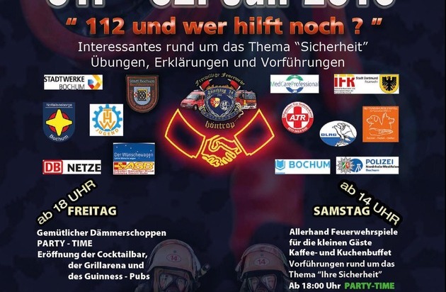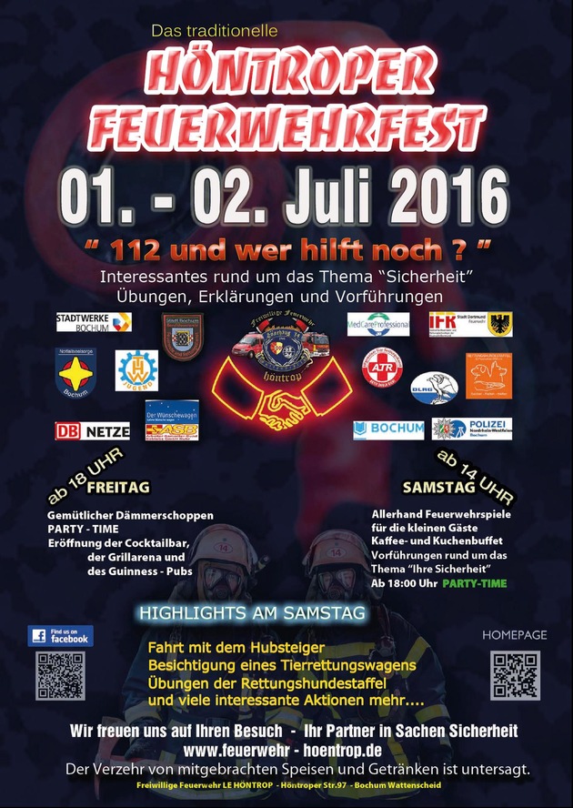 Die Löscheinheit Wattenscheid-Höntrop veranstaltet vom 1. Juli bis zum 2. Juli 2016 wieder ihr Feuerwehrfest. Hierzu sind alle Interessierten eingeladen, die mehr über die Arbeit der Freiwilligen Feuerwehr erfahren möchten. In diesem Jahr wird am Samstag das Thema "Ihre Sicherheit" besonders dargestellt, unter anderem mit Vorführungen und Übungen. Beginn ist Freitag um 18:00 Uhr und Samstag um 14:00 Uhr. Für das leibliche Wohl ist gesorgt.