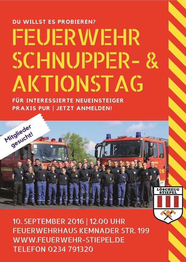 Am Samstag, den 10.09.2016, veranstaltet die Löscheinheit Stiepel der Freiwilligen Feuerwehr Bochum, erstmalig einen Schnupper- und Aktionstag. Ziel ist es, interessierten Frauen und Männern die Gelegenheit zu geben, die Arbeit der Freiwilligen Feuerwehr einmal an vorderster Front auszuprobieren. Es würde uns sehr freuen, wenn dadurch jemand seine Leidenschaft für die Freiwillige Feuerwehr entdeckt. In der Zeit von 12 Uhr bis ca. 16 Uhr werden kleine Einsatzübungen zusammen mit aktiven Kameraden durchgeführt. Das Ganze findet auf unserem Außengelände und im Feuerwehrhaus (Kemnader Straße 199) statt. Damit wir diesen Tag planen können, ist eine Anmeldung erwünscht. Anmelden kann sich jeder/jede Interessierte ab einem Alter von 17 Jahren. Nach erfolgter Anmeldung erhalten die Teilnehmer ein Tagesprogramm zugesandt. Es entstehen keine Kosten oder Verpflichtungen für die Teilnehmer des Schnuppertages!