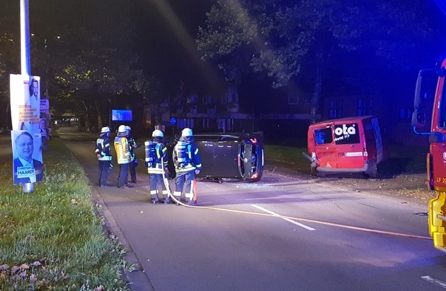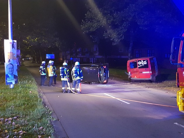 Zu einem schweren Verkehrsunfall mit drei verletzten Personen kam es am Freitagmorgen gegen 00:38 auf der Königsallee in Höhe der Knappschaftstraße. Gleich mehrere Anrufe alarmierten am frühen Freitagmorgen die Feuerwehr zu einem Verkehrsunfall auf der Königsallee. Da gemeldet wurde das ein PKW auf der Seite liege und die Insassen nicht aus dem Fahrzeug kommen ging die Feuerwehr davon aus das ggf. Personen eingeklemmt sind. Ein PKW mit drei Insassen war aus noch ungeklärter Ursache auf einen auf dem Parkstreifen abgestellten Kleintransporter aufgefahren und ist nach der Kollision seitlich auf der Fahrbahn liegen geblieben. Die drei mittelschwer verletzten Insassen konnten ohne technische Hilfe aus dem Fahrzeug befreit werden. Nach einer Erstversorgung durch den Notarzt wurden sie in umliegende Kliniken gebracht. Die Königsallee wurde durch die Freiwilligen Feuerwehr, LE Bochum Mitte, ausgeleuchtet und blieb zur Unfallaufnahme in Fahrtrichtung Innenstadt gesperrt. Insgesamt waren 34 Einsatzkräften von Feuerwehr und Rerttungsdienst, vor Ort.