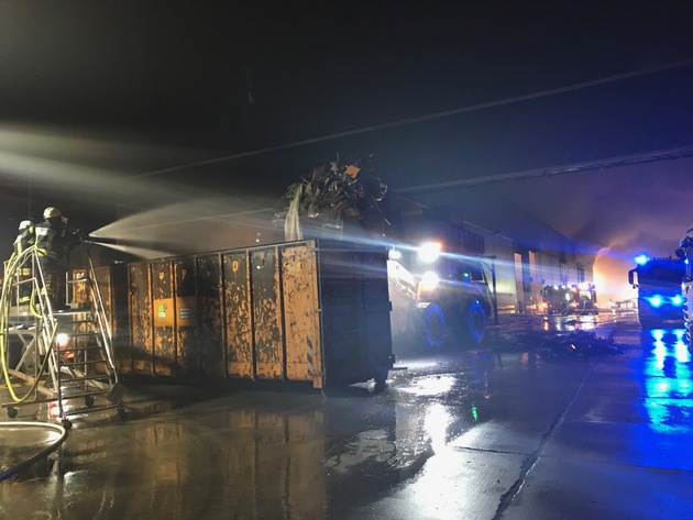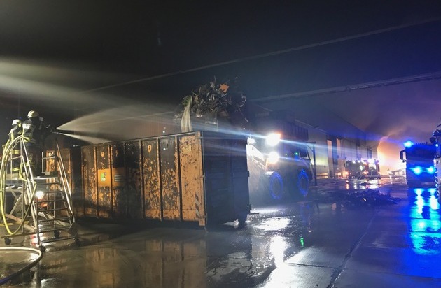 Das Feuer ist unter Kontrolle. Die ersten Kräfte werden nun ausgelöst, heute Nacht werden immer ca. 20 Einsatzkräfte vor Ort sein. Die Radlader, die durch das THW gefahren werden, transportieren das Brandgut aus der Halle. Dort wird es abgelöscht und in Container verladen. Die Arbeiten gehen gut voran, werden aber noch einige Stunden andauern. Eine weitere Pressemitteilungen erfolgen nach Abschluss des Einsatzes.