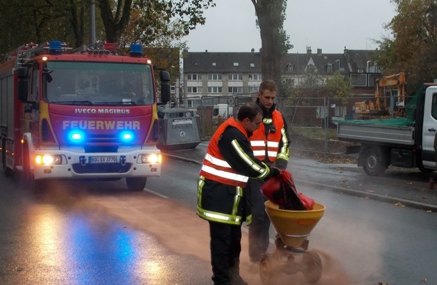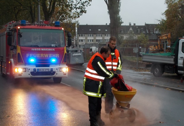 Am heutigen Dienstag kam es im Bereich Friedrich-Ebert-Str. - Marienstr. - Lohrheidestr. - Gelsenkirchenerstr. aufgrund einer ca. 4 km langen Kraftstoff-Spur zu Verkehrsbehinderungen. Mehrere Anrufer meldeten die bunt schimmernde Spur, die sich quer durch Wattenscheid zog und bis in das Stadtgebiet von Gelsenkirchen hinein reichte. 23 Einsatzkräfte der Berufs- und Freiwilligen Feuerwehr brauchten heute gut zwei Stunden um die Gefahrenstelle zu beseitigen. Dazu wurden insgesamt 120 Sack Bindemittel eingesetzt. Dies entspricht einem Gewicht von 2,4t. Um das Bindemittel wieder aufzunehmen und fachgerecht zu entsorgen, wurden zwei Kehrmaschinen des USB eingesetzt. Die Einsatzstelle wurde abschließend durch das Tiefbauamt wieder für den Verkehr freigegeben. Die Löscheinheiten Wattenscheid-Mitte und Günnigfeld unterstützen die Kollegen der Berufsfeuerwehr. Die Ermittlungen zum Versucher dauern aktuell noch an.