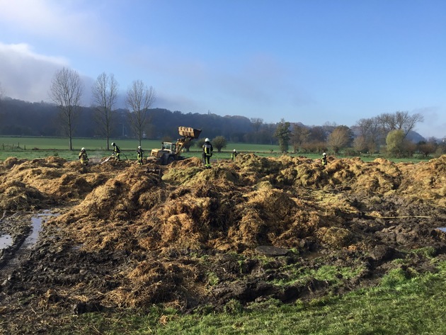 Das Feuer in Bochum-Stiepel ist gelöscht. Nach fast 16 Stunden Einsatz ist die Scheune komplett leer geräumt und das Stroh befindet sich auf einer angrenzenden Wiese, wo noch Restlöscharbeiten durchgeführt werden. Die verbliebenen Einsatzkräfte haben mittlerweile mit dem Aufräumen begonnen. Über 1 km Schlauchleitungen werden für die Wasserversorgung werden abgebaut und zur Hauptwache gebracht, wo alles gereinigt wird. Auch der Eigentümer mit seinen Mitarbeitern hat mit dem Aufräumen begonnen. Die Einsatzstelle wurde mittlerweile von der Polizei für die Brandursachenermittlung übernommen. Es waren zeitweise über 100 Einsatzkräfte gleichzeitig vor Ort, dabei wurde die Berufsfeuerwehr vom THW und allen Freiwilligen Löscheinheiten unterstützt.