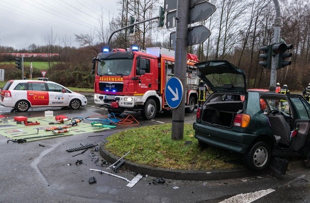 Am Freitagmittag kam es auf dem Werner Hellweg im Bereich der Kreuzung Industriestraße zu einem schweren Verkehrsunfall, bei dem vier Personen verletzt wurden, eine davon schwer. Den Fahrer eines PKWs musste die Feuerwehr aus seinem Fahrzeug befreien. Gegen 14 Uhr wurde der Leitstelle der Feuerwehr der Verkehrsunfall durch mehrere Anrufer gemeldet. Zwei PKW, jeweils besetzt mit zwei Personen, waren auf der Kreuzung kollidiert. Durch den Aufprall wurde der Fahrer eines Fahrzeuges schwer verletzten in seinem PKW eingeklemmt. Die anderen Insassen wurden leicht verletzt, konnten die Autos aber selbstständig verlassen. Ein Mitarbeiter der Berufsfeuerwehr, der Augenzeuge des Unfalls war, sowie ein zufällig an der Einsatzstelle vorbeifahrender Rettungswagen, leisten sofort Erste Hilfe. Weitere Einsatzkräfte wurden von der nahen Hauptfeuerwache und aus der Innenstadtwache alarmiert. Mit hydraulischem Rettungsgerät gelang es den Einsatzkräften den ansprechbaren Mann nach knapp 20 Minuten aus seinem Wagen zu befreien. Dafür musste unter anderem die Fahrertür des PKW entfernt werden. Schon während der Rettung wurde der Verletzte durch einen Notarzt und den Rettungsdienst erstversorgt. Alle Verletzten wurden mit Rettungswagen in verschiedene Krankenhäuser transportiert. Nach der Rettung und Versorgung der Verletzten wurde durch die Feuerwehr noch ausgelaufene Betriebsstoffe der Fahrzeuge abgestreut und die Batterien abgeklemmt. Anschließend wurde die Einsatzstelle der Polizei zur Unfallursachenermittlung übergeben. Insgesamt waren 22 Einsatzkräfte von Feuerwehr und Rettungsdienst vor Ort.