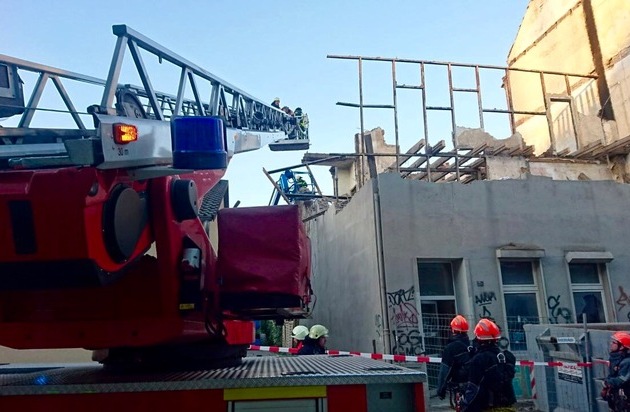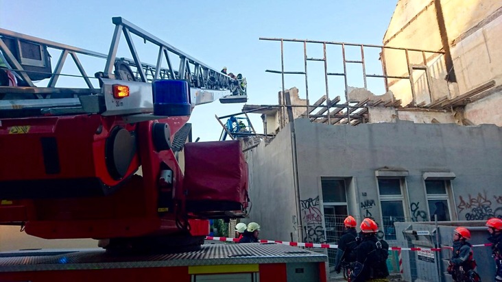 Um 8.44 Uhr ging der Notruf in der Leitstelle der Feuerwehr ein. Bei Abbrucharbeiten an einem Haus in der Düppelstraße waren Teile der Dachkonstruktion und des Mauerwerks auf einen Arbeiter im Korb einer Hubarbeitsbühne in fünf Meter Höhe gestürzt. Auch ein Stahlträger prallte gegen den Mann und den Korb. Durch den Aufprall wurde der Arbeiter lebensgefährlich verletzt und die Arbeitsbühne wurde gegen die Hauswand gedrückt, sodass diese nicht mehr bewegt werden konnte. Sofort alarmierte die Leitstelle der Feuerwehr Einsatzkräfte der Innenstadtwache sowie die Höhenretter, den Kranwagen und einen Rüstwagen zur Einsatzstelle. Die ersteintreffenden Einsatzkräfte gelangten zunächst über eine tragbare Leiter zu dem Arbeiter, um ihn noch im Korb der Arbeitsbühne zu versorgen. Glücklicherweise war der Mann nicht eingeklemmt. Über eine Drehleiter gelang es nach etwa 15 Minuten, den Verletzten zu retten. Durch einen Notarzt wurde der lebensgefährlich verletzte Mann noch vor Ort erstversorgt und anschließend in ein Krankenhaus transportiert. Zur Unfallursache hat die Kriminalpolizei die Ermittlungen aufgenommen. Die Feuerwehr war mit insgesamt 35 Einsatzkräften vor Ort.