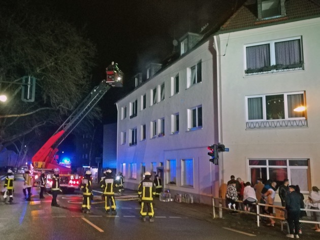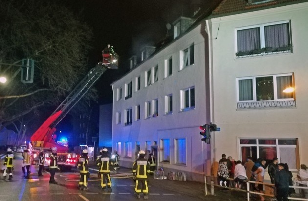 "Kommen sie schnell, hier ist alles voller Rauch", "Hilfe, hier brennt es und die Menschen wollen vom Dach springen!" - Das waren zwei von unzähligen Notrufen, die um kurz vor 4 Uhr am Freitagmorgen die Leitstelle der Feuerwehr Bochum erreichten und die deutlich machen, welch dramatische Szenen sich in dem Wohnhaus am Aschenbruch in Günnigfeld abspielten. Sofort wurden Einsatzkräfte aller drei Feuer- und Rettungswachen der Berufsfeuerwehr sowie die Löscheinheit Günnigfeld der Freiwilligen Feuerwehr alarmiert. Beim Eintreffen des Löschzuges der Feuerwache Wattenscheid drang dichter Rauch aus dem Keller des dreigeschossigen Wohnhauses sowie aus einigen Fenstern der Wohnungen. Mehrere Menschen machten sich an Fenstern bemerkbar und riefen um Hilfe, da ihnen der Fluchtweg durch den komplett verrauchten Treppenraum abgeschnitten war. Weitere Anwohner hatten sich bereites selbst in Sicherheit gebracht und standen zum teil nur leicht bekleidet im Freien.