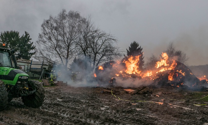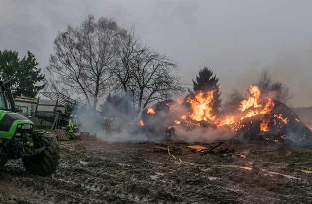 Die Einsatzmaßnahmen an der Beregnen Straße dauern an. Auf dem Feld brennen nach wie vor 250 - 300 Strohballen. Das Feuer wird derzeit kontrolliert herabbrennen gelassen, um somit sowohl die Rauchentwicklung als auch den Umweltschaden durch das halb verbrannte Stroh so gering wie möglich zu halten. Eine Ausbreitung des Brandes auf Landwirtschaftsmaschinen konnte verhindert werden. Der Besitzer des Strohs unterstützt die Maßnahmen mit einem Radlader, in dem er die Ballen auseinander zieht.