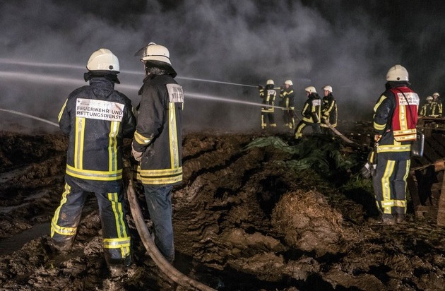 Fünfeinhalb Stunden nach Einsatzbeginn konnte die Einsatzstelle an der Bergener Straße um 19.45 Uhr an den Eigentümer übergeben werden. Zuvor waren die Reste der knapp 300 Strohballen mit einem massiven Wassereinsatz aus sieben Strahlrohren abgelöscht worden. Bis zu diesem Zeitpunkt waren deutlich mehr als 3/4 der Strohballen kontrolliert verbrannt. Die Löschmaßnahmen zeigten sehr schnell den gewünschten erfolg, sodass auch die Warnung vor einer Geruchsbelästigung aufgehoben wurde. Insgesamt waren rund 40 Einsatzkräfte überwiegend der Freiwilligen Feuerwehr vor Ort.
