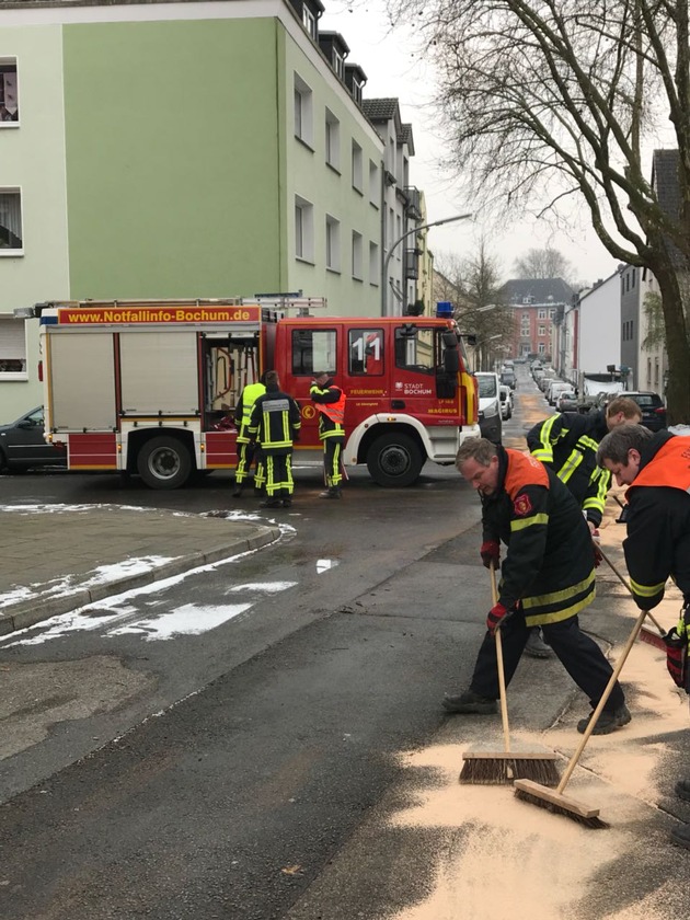 Gegen 12:26 Uhr am Samstag wurde die Feuerwehr Bochum zu drei parallelen Ölspuren alarmiert. Als erstes wurde eine Ölspur in Querenburg im Bereich Universitätstraße / Hustadtring, weiter über "Auf dem Aspei", Overbergstraße und Eulenbaumstraße gemeldet. Nur zwei Minuten später, um 12.28 Uhr, meldete ein Anrufer eine weitere Ölspur am Freigrafen Damm, die über die Wittener Straße bis Ostring ging. Nahezu Zeitgleich meldeten Passanten eine dritte Betriebsmittelspur in Günnigfeld im Bereich Weststraße, Hansastraße, Blücherstraße, Günnigfelder Straße und dann weiter im Herner Stadtgebiet. Insgesamt waren 43 Einsatzkräfte Berufsfeuerwehr und der Freiwilligen Feuerwehr Wattenscheid, Günnigfeld, Mitte und Nord im Einsatz. Die Einsätze erforderten einen hohen Materialaufwand: Um die ausgetretenen Betriebsstoffe aufnehmen zu können, wurden bisher über 115 Säcke Ölbindemittel auf einer Gesamtstrecke von ca. 13 km benötigt. Die gebundenen Betriebsstoffe nahmen die Kehrmaschinen des USB auf. Der Bereich an der Universitätsstraße / Hustadtring und der Bereich Freigrafen Damm sind fertig abgearbeitet. Die Löscheinheiten in Wattenscheid sind ca. noch eine Stunde im Einsatz. Es ist in diesem Bereich weiterhin mit Verkehrsbehinderungen zu rechnen.