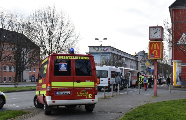 Dortmund, Mitte-Nord: Heute Mittag gegen 13:45 Uhr wurde der Einsatzleitstelle der Feuerwehr ein Verkehrsunfall zwischen einem Schulbus und einem Linienbus auf der Brackeler Straße gemeldet. Die ersteintreffenden Rettungskräfte stellten vor Ort schnell fest, dass glücklicherweise niemand bei dem Unfall ernsthaft verletzt wurde. Nach Eingang des Notrufes entsandte die Einsatzzentrale sofort mehrere Rettungswagen und Feuerwehrkräfte zur Brackler Straße. Nach ersten Schilderungen des Anrufes wurde davon ausgegangen, dass mindestens 10 Personen verletzt waren. Bei den ersten Erkundungen des Einsatzleiters stellte sich dann schnell heraus, dass sich der Linienbus auf einer Leerfahrt befand und dass alle Kinder im Schulbus sowie beide Fahrer glücklicherweise unverletzt geblieben waren. Lediglich ein Mädchen der 8 Schüler im Schulbus wurde vorsorglich ohne weitere Feststellung vom Rettungsdienst untersucht.