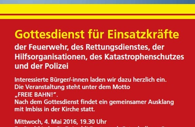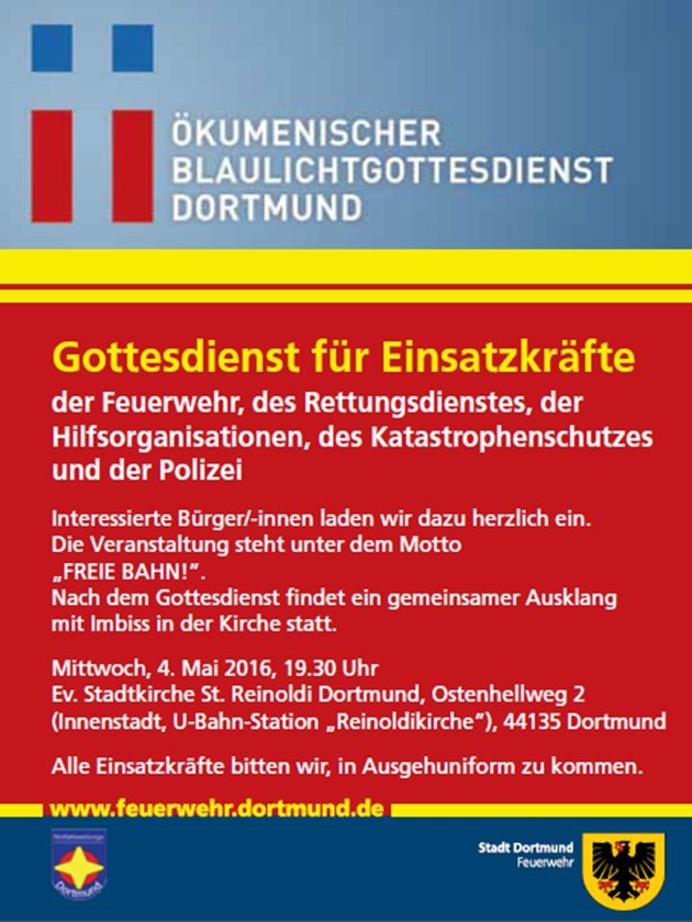 Dortmund-Mitte: Unter dem Motto "Freie Bahn" laden wir alle Einsatzkräfte der Feuerwehr, des Rettungsdienstes, der Hilfsorganisationen, des Katastrophenschutzes, der Polizei und natürlich interessierte Bürger/-innen zu unserem Gottesdienst recht herzlich ein. Der Gottesdienst findet am Mittwoch, den 4. Mai 2016, um 19:30 Uhr in der Ev. Stadtkirche St. Reinoldi Dortmund am Ostenhellweg in der Dortmunder Innenstadt statt und wird von Mitarbeitern der Notfallseelsorge sowie Kameraden der Feuerwehr gestaltet.