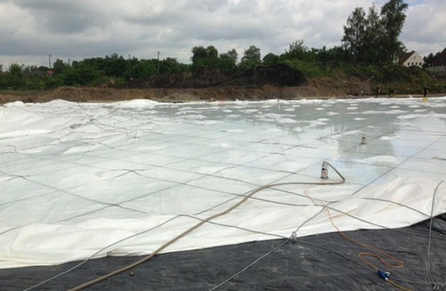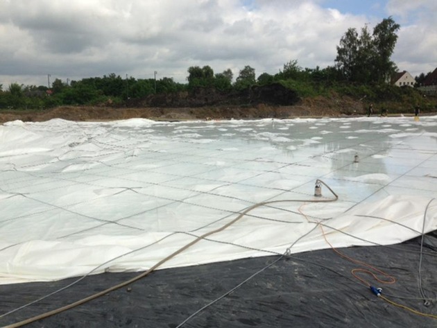 Die am Sonntagmorgen um 9 Uhr alarmierten Einheiten der Feuerwehr unterstützen das Unternehmen durch den Einsatz von mehreren Pumpen und Stromaggregaten, um das Wasser abzupumpen und ein Aufstellen der Traglufthalle zu ermöglichen.