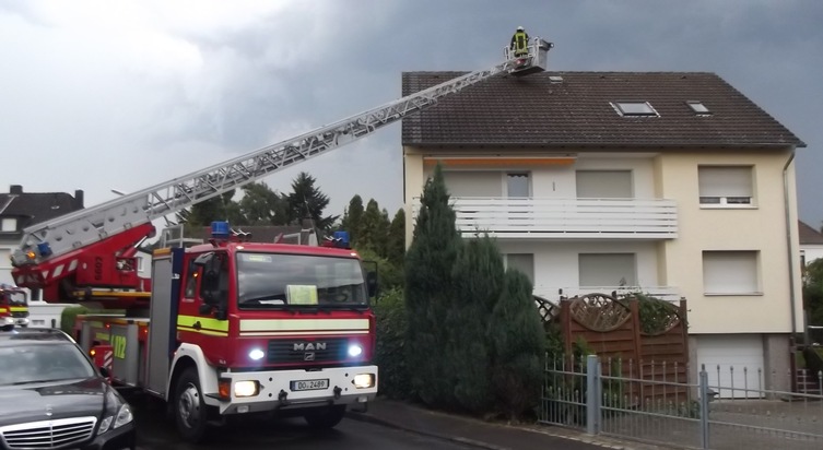 Um kurz nach 20 Uhr ist in der Straße An der Windhake im Stadteil Scharnhorst ein Blitz in den Schornstein eines Mehrfamilienhauses eingeschlagen. Die Feuerwehr setzte eine Drehleiter zur Kontrolle des Daches ein.