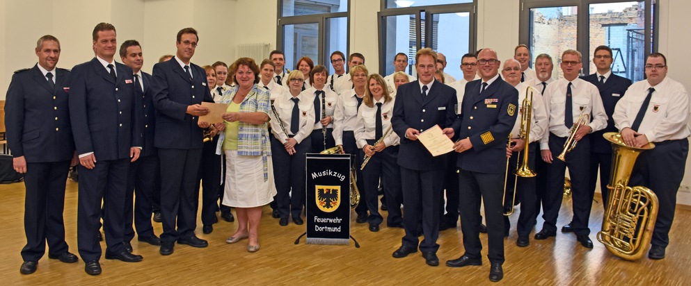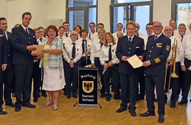Im Rahmen eines Gründungskonzertes im Orchesterzentrum Dortmund wurde am Samstagabend (10.09.) der Musikzug der Freiwilligen Feuerwehr nun offiziell in Dienst gestellt. Er besteht aus 29 Mitgliedern und ist als Blasorchester in Harmoniebesetzung (Holz- und Blechbläser) organisiert. Geleitet wird die Musikeinheit von Torsten Wilhelm als Einheitsführer und Tim Harig als musikalischer Leiter. Beide werden im Zuge des Gründungskonzertes in ihren Funktionen durch den Feuerwehrchef Dirk Aschenbrenner ernannt. Beheimatet ist der Musikzug an der Feuerwache 8 (Eichlinghofen), wo auch die Proben in einer Fahrzeughalle stattfinden. Zweck der Gründung ist die Stellung von Musik bei besonderen und repräsentativen Anlässen der Feuerwehr Dortmund auch über die Stadtgrenzen hinaus. Die derzeit 17 Männer und 12 Frauen im Alter zwischen 15. und 74. Jahren freuen sich natürlich noch auf Zuwachs. Bei Interesse kann ein Kontakt unter 37pressestelle@stadtdo.de aufgenommen werden. Die ersten Überlegungen zur Gründung eines eigenen Musikzuges in Dortmund waren bereits im Oktober 2012 vorhanden, dazu wurde bereits im November 2012 die Satzung des Dortmunder Stadtfeuerwehrverbandes geändert, um die Interessen von den zukünftigen Mitgliedern vertreten zu können. Die Aufstellung als organisatorische Einheit der Freiwilligen Feuerwehr erfolgte dann am 01.12.2004. Von den anfänglich 18 Musikern sind heute noch 11 aktiv. Erste Auftritte erfolgten bereits bei verschiedenen Veranstaltungen der Feuerwehr (Blaulichtgottesdienst, 112 Jahr Feier, ...) und der Musikerkreis erweiterte sich stetig. Auch außerhalb des Dortmunder Stadtgebietes erfolgten Auftritte (Institut der Feuerwehr in Münster im Rahmen einer Laufbahnprüfung) der Einheit mit dem Erfolg, dass viele Anfragen für weitere Auftritte folgten.