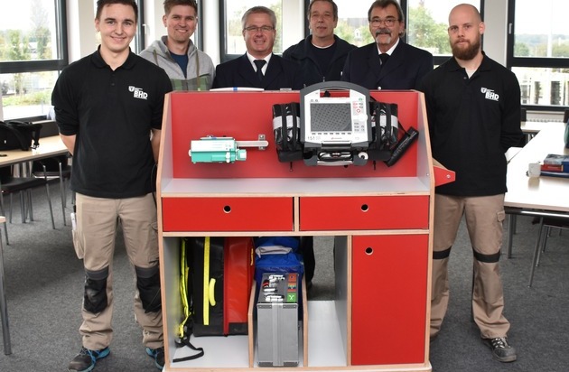 Nach gut dreimonatiger Bauzeit war der Prototyp fertig gestellt. Alle an dem Bau beteiligten Personen trafen sich zur Übergabe am Ausbildungszentrum der Feuerwehr. Somit zeigt sich wieder einmal, dass die Kombiausbildung eine gute Sache ist.