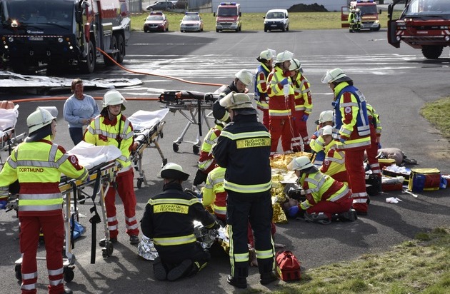 Am Samstag den 11.03.2017 wurde am Dortmunder Flughafen die von der Internationalen Zivlluftfahrtorganisation (ICAO) für alle zwei Jahre vorgeschriebene Vollübung durchgeführt. Unter Beteiligung der Feuerwehren aus Dortmund und Unna, des Rettungsdienstes der Stadt Dortmund, der Polizei (Bund und Land) und des Special Assistance Team (SAT) des Dortmunder Flughafens wurden die Schnittpunkte in der Zusammenarbeit der verschiedenen Einheiten geübt.So wurden die Melde- und Alarmierungswege zwischen Flughafenfeuerwehr und Feuerwehr Dortmund überprüft, die Zusammenarbeit zwischen Feuerwehren, Rettungsdienst und externen Kräften abgestimmt, die medizinische Erstversorgung geprobt und die Durchführung einer psychosozialen Notfallversorgung von unverletzt betroffenen Personen beübt. Das Übungsszenario war folgendermaßen vorgegeben: Ein Kleinflugzeug mit vier Personen an Bord hat nach dem Start Richtung Westen einen Strömungsabriss und weicht vom Kurs ab. Es kommt zu einer Kollision mit dem Rollweg und einem Schulungsgebäude des Flughafens. Das Kleinflugzeug gerät in Vollbrand und Trümmerteile erschweren den Rettungsweg. In dem Gebäude befinden sich 19 Personen. Die Unglücksmaschine ist als Rundflug anlässlich eines 50. Geburtstages gestartet und Angehörige der Passagiere sind auf dem Flughafengelände, haben den Absturz miterlebt und müssen psychologisch betreut werden. Zum Ablauf: Nach der Alarmierung der Kräfte der Flughafenfeuerwehr durch Auslösen des sogenannten Crashmelders im Tower fuhr das erste Flugfeldlöschfahrzeug (FLF Panther) zur Einsatzstelle. Nach den ICAO-Vorgaben muss jede Stelle auf dem Gelände innerhalb von drei Minuten erreicht werden. Zeitgleich wurden Unterstützungskräfte von der Feuerwehr Dortmund und Unna, sowie zahlreiche Rettungsdienstkräfte alarmiert. An der Unfallstelle angekommen nahmen die ersten Kräfte sofort die Löschmaßnahmen auf und begannen mit der Rettung der verletzten Personen, die von einem Team von Realistischen Unfalldarstellern (RUD) des Jugendrotkreuz dargestellt wurden, aus dem Kleinflugzeug. Die Betreuung der unverletzten, betroffenen Personen in der Nähe der Unfallstelle, die von einer Schauspielklasse aus Wiesbaden gestellt wurden, übernahmen in dieser Anfangsphase die nachrückenden Kräfte der Flughafenfeuerwehr, die sich aus Mitarbeitern des Bodenverkehrsdienstes mit einer entsprechenden Zusatzausbildung zusammensetzen. Die jetzt nach und nach anrückenden Rettungsdienst- und Feuerwehrkräfte unterstützten bei der Versorgung der Verletzten und der Rettung der Personen aus dem Schulungsgebäude. Zu diesem Zeitpunkt kommen auch das SAT des Flughafens, das PSNV-Team der Feuerwehr und die Notfallseelsorger zur weiteren Betreuung der betroffenen Angehörigen und Schulungsteilnehmer zum Einsatz. Nach Übungsende wurde der Verlauf in einzelnen Abschnitten mit den zuständigen Schiedsrichtern nachbesprochen. Die anschließende Verpflegung aller Übungsbeteiligten wurde durch Kräfte des Verpflegungszuges der Freiwilligen Feuerwehr Löschzug16 (Hombruch) sichergestellt. An der Übung waren rund 200 Einsatzkräfte von Feuerwehr, Polizei und Rettungsdienst beteiligt.