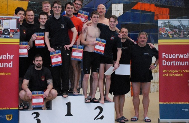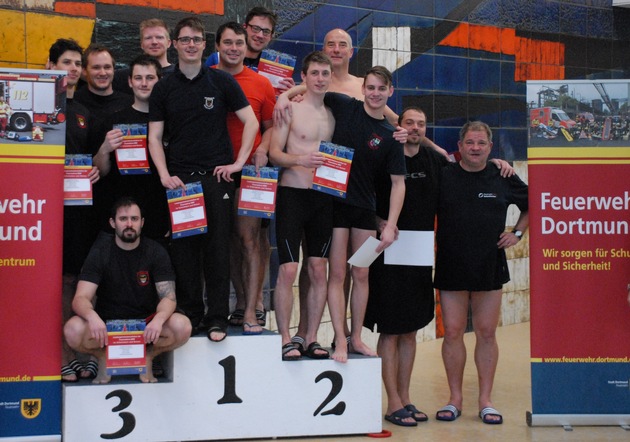 Nach dreijähriger Pause fanden am Samstag den 03.02.2018 im Hallenbad "Die Welle" in Dortmund-Scharnhorst wieder die Landessportmeisterschaften der Feuerwehren NRW im Schwimmen und Retten statt. 52 gemeldete Teilnehmer (-innen) von 11 Feuerwehren maßen sich im sportlichen Wettkampf in 5 Rettungs- und 7 Schwimmdisziplinen. Außerdem wurden drei Schwimmstaffeln ausgeschwommen. In zwei der Staffeln, der 4 x 50m Lagenstaffel und der 4 x 50m Rettungsschwimmstaffel wurden gleichzeitig die Qualifikationen für die im April in Lübeck stattfindenden Deutschen Mannschaftsmeisterschaften der Berufsfeuerwehren ausgeschwommen. Die beiden erst- und zweitplatzierten Mannschaften der jeweiligen Staffeln qualifizieren sich automatisch. In der 4 x 50m Lagenstaffel siegte die Feuerwehr Dortmund vor der Feuerwehr Aachen. In der 4 x 50m Rettungsschwimmstaffel siegte ebenfalls die Feuerwehr Dortmund vor der zweitplatzierten Feuerwehr aus Gelsenkirchen. Wir wünschen den qualifizierten Mannschaften von hier aus viel Glück für die Teilnahme an den Wettkämpfen in Lübbeck. Erfolgreichste Einzelstarter waren Frank Feldmann von der Feuerwehr Hamm mit vier ersten, einem zweiten und einem dritten Platz gefolgt von Christoph Litters von der Feuerwehr Dortmund mit zwei ersten, einem zweiten und einem dritten Platz. Als älteste Teilnehmer im nahmen Frank von Klonczynski (58) von der Feuerwehr Dortmund und Klaus Kordel (57) von der Feuerwehr Witten an den Wettkämpfen teil. Die ausrichtende Feuerwehr Dortmund bedankt sich auf diesem Weg auch noch einmal bei den Unterstützern, wie dem Träger des Schwimmbades SV Derne 1949 Dortmund e.V., dem DLRG Bezirk Dortmund für die Gestellung der notwendigen Ausrüstung der Rettungs-schwimmdisziplinen und dem aktuellen Grundausbildungslehrgang, der sich für die gute Durchführung der Wettkämpfe verantwortlich zeigte. 1. Platz 2. Platz* 3. Platz Feuerwehr Dortmund 5 4 2 Feuerwehr Hamm 4 1 4 Feuerwehr Gelsenkirchen 3 3 1 Feuerwehr Aachen 2 2 0 Feuerwehr Essen 1 1 3 Feuerwehr Duisburg 5 1 Feuerwehr Witten 1 1 Werkfeuerwehr Currenta 2