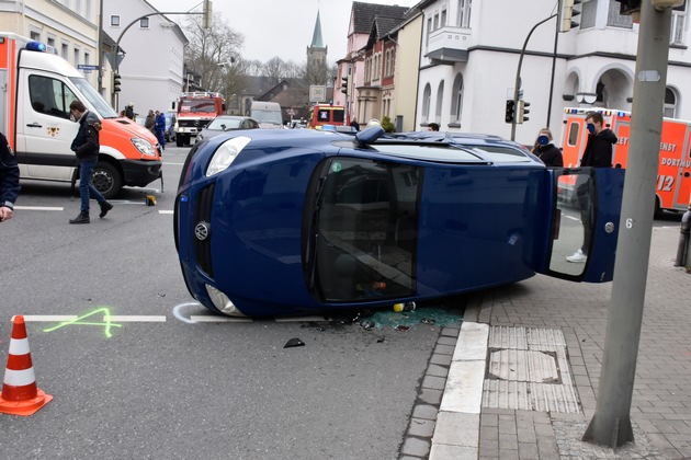Der Rettungswagen, der mit Signalhorn und Blaulicht unterwegs war, befuhr die Westermannstraße in Richtung Westen. Im Kreuzungsbereich kam es dann zu einem Zusammenstoß mit einem Kleinwagen, der infolge des Zusammenstoßes auf die Seite kippte. Die Pkw-Fahrerin konnte sich selbst aus ihrem Pkw befreien. Der Fahrer des Rettungswagens und die Fahrerin des Kleinwagens wurden zur weiteren Untersuchung in ein Krankenhaus transportiert.