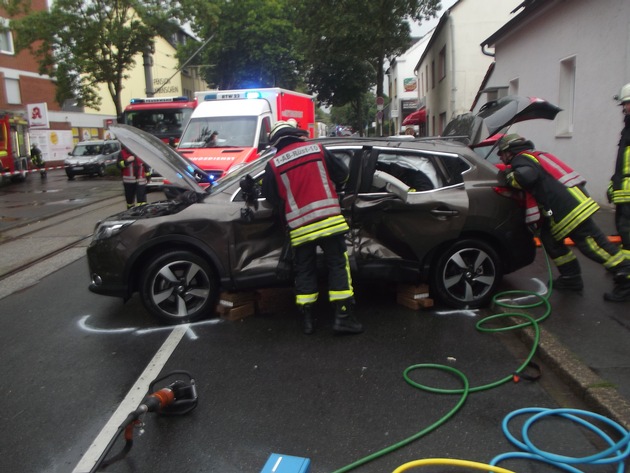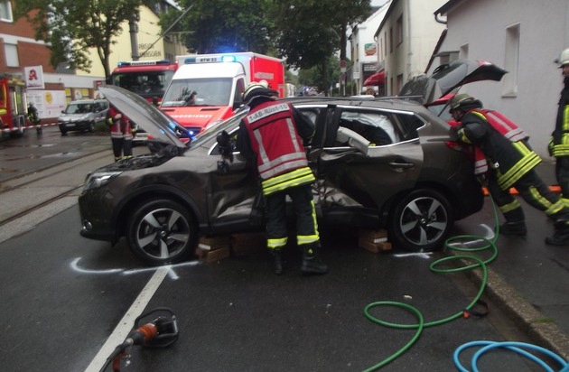 Gegen 16:20 Uhr wurde die Feuerwehr Dortmund zu einem Verkehrsunfall auf dem Wickeder Hellweg alarmiert. Eine Straßenbahn war mit einem PKW kollidiert. Bei dem Zusammenstoß wurde eine Person schwer verletzt. Durch die Wucht des Aufpralls kam der PKW quer zur Fahrbahn zum Stehen. Das Fahrzeug war so stark beschädigt, dass der Fahrer von der Feuerwehr aus dem Fahrzeug befreit werden musste. Nach der medizinischen Versorgung durch Kräfte des Rettungsdienstes wurde der Verletzte in einer schonenden Rettung über die Hecköffnung aus dem Fahrzeug befreit. Im Anschluß an die Rettung transportierte ein Rettungswagen den 18-jährigen Patienten zur weiteren Behandlung in ein Krankenhaus. Eine Zeugin des Unfalls und eine weitere Passantin mussten kurzzeitig durch den Rettungsdienst betreut werden. Für die Dauer der Rettungsmaßnahmen musste der Wickeder Hellweg komplett gesperrt werden, was für erhebliche Behinderungen im Berufsverkehr gesorgt hat. Insgesamt wurden rund 30 Einsatzkräfte der Feuerwache 3 (Neuasseln), der Spezialeinheit Bergung der Feuerwache 1 (Mitte) und des Rettungsdienstes eingesetzt.