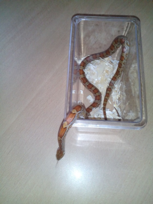 Die Feuerwehrleute konnten die Kornnatter schnell einfangen und nahmen das Kriechtier in einer Reptilienbox mit auf die Feuerwache. Ein Reptilienfachmann begutachtete den Gesundheitszustand des Tieres, bevor die Feuerwehrleute wieder zu Bett gingen.