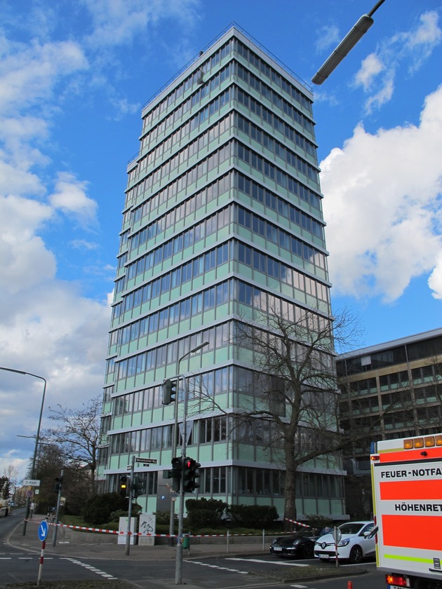 Die zunächst aufgrund der Meldung "Sturmschaden" alarmierte Drehleiter der Feuerwache Münsterstraße stellte bereits kurz nach dem Eintreffen fest, dass die lose Jalousie aufgrund der Höhe im 12. Obergeschoss des Bürogebäudes nicht erreicht werden konnte und forderte umgehend die Höhenrettungsgruppe sowie den zuständigen Führungsdienst der Feuerwache Münsterstraße nach.