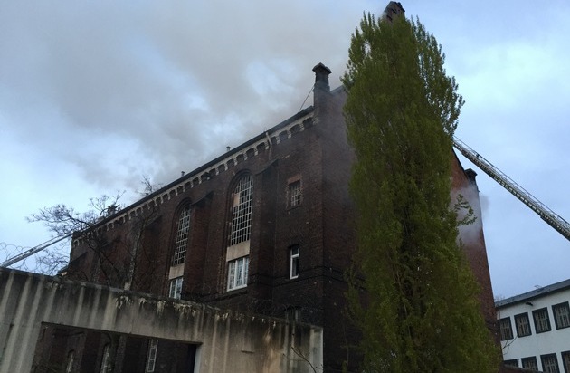 Auf dem Gelände der ehemaligen JVA in der Ulmenstraße ist es aus ungeklärter Ursache zu einem Brand gekommen. Der Dachstuhl der Kapelle sowie darunterliegende Geschosse sind davon betroffen. Beim Eintreffen der Feuerwehr schlugen die Flammen bereits mehrere Meter aus dem Dachstuhl des Gebäudes empor.