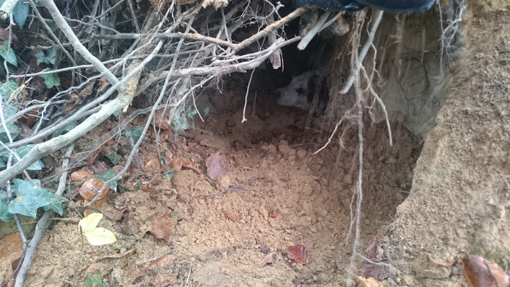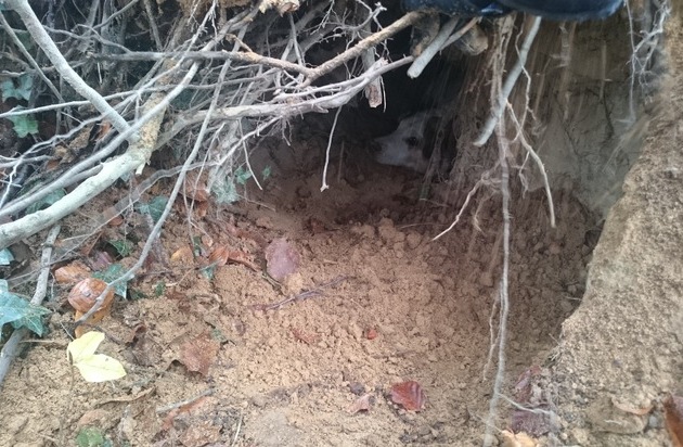 Der 13 -Jahre alte Mischling "Karla" war im Wald unterwegs und stieß unter einer Baumwurzel auf ein größeres Loch welches sein Interesse weckte. Aufgeregt buddelte er das Loch tiefer und tiefer und bemerkte nicht, das er so tief buddelte, dass er von alleine nicht mehr herauskam. Als es weder vorwärts noch rückwärts weiterging jaulte er verzweifelt auf. Sofort versuchte sein "Frauchen" ihn aus seiner Zwangslage zu befreien gab aber nach einigen Minuten auf und wählte den Notruf 112.