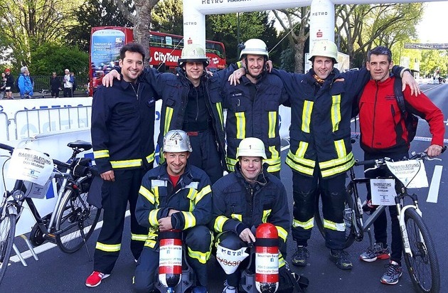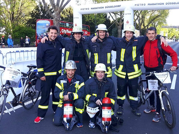 Fast schon traditionell nahmen Feuerwehrmänner am diesjährigen Marathon der Landeshauptstadt Düsseldorf teil. Sie hatten sich ein großes und beeindruckendes Ziel gesteckt, sie liefen in kompletter Schutzausrüstung. Christian Ruda lief erstmals die komplette Distanz über 42,195 km in voller Kleidung inklusive Atemschutzgerät und Helm. Gerade einmal 4 Std. und 23 Min. benötigte er für diese Strecke unter den erschwerenden Bedingungen. Mit ihm am Start waren seine Kollegen Jörn Janetschek, Matthias Tooten, Patrick Rauscher und Thomas Barzen. Sie teilten sich die Strecke als Staffel. Auch sie liefen ihre Abschnitte in kompletter Montur. Auf dem Rad bekamen sie zusätzliche Versorgung und Unterstützung durch Ingo Hansen und Thorsten Mülberg.