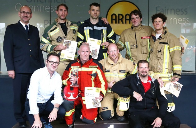 Beim heutigen 10. Skykun der Feuerwehrsportvereinigung Düsseldorf fließen nicht nur viele Liter Regenwasser am ARAG-Tower hinunter. Die 400 Teilnehmer verloren in ihrer Schutzkleidung sicherlich auch viele Liter Schweiß auf dem Weg bis in die 25. Etage. Nach sieben Durchgängen folgte noch der Finallauf: Jens Lüdeke und Martin Brieden vom Team "Hier könnte ihre Werbung stehen" entschieden den Endlauf mit einer Zeit von 4.14 Minuten gegen die Feuerwehrleute Krißmer und Woito von der Bundeswehr (4:47 Minuten) für sich. Der dritte Platz ging an die Titelverteidiger aus Ratingen Stefen Rick und Thomas Tremmel.