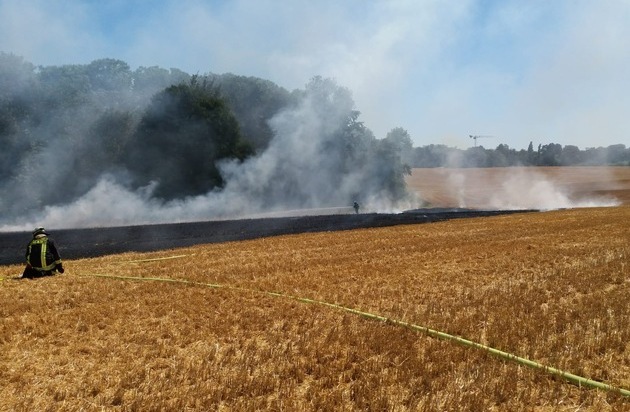 Stoppelfeldbrand in Hubbelrath forderte Freiwillige und Berufsfeuerwehr. Ein Übergreifen auf den benachbarten Wald konnte verhindert werden. Es kamen keine Personen zu schaden.