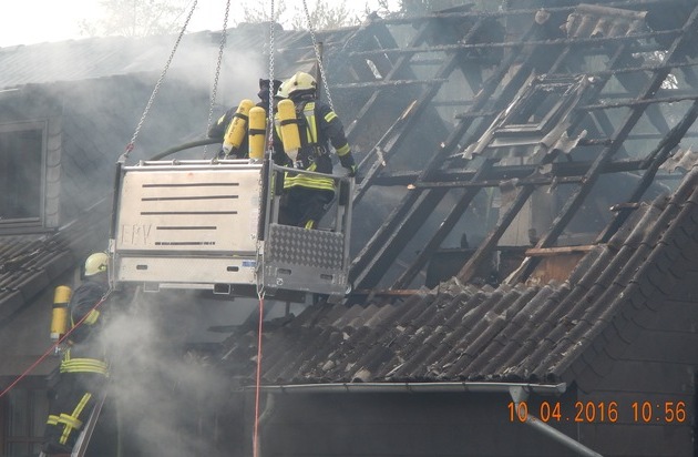 Zur besseren Erreichbarkeit und für den Teilabriss des von der Straße zurückliegenden Gebäudes wurde der Feuerwehrkran mit Personenkorb eingesetzt. Das Ablöschen der Brandnester gestaltet sich dabei als sehr langwierig, da zwei an das Brandhaus angebaute Gebäude über die Holzbalkendecken mit diesem in Verbindung stehen und sich das Feuer schon in diese Decken hinein gefressen hatte. Zur Kontrolle setzte die Feuerwehr auch eine Wärmebildkamera ein.