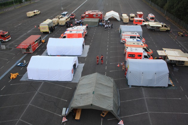 Etwa 130 Kräfte, bestehend aus Mitgliedern der vier Hilfsorganisationen ASB (Arbeiter Samariter Bund), DRK (Deutsches Rotes Kreuz), JUH (Johanniter Unfallhilfe) und MHD (Malteser Hilfsdienst), den Einheiten Günhoven/Kothausen, Beckrath, Wickrathhahn und der IuK-Gruppe der Freiwilligen Feuerwehr und der Feuer- und Rettungswache II und die Abteilung Technik und Logistik der Berufsfeuerwehr, übten am 09.09.2016 ab 17:00 Uhr den Aufbau des Landeskonzeptes BHP-B 50 NRW (Behandlungsplatzbereitschaft 50 NRW) auf dem Messeparkplatz Gladbacher Straße/Am Borussiapark oder waren als Beobachter tätig.