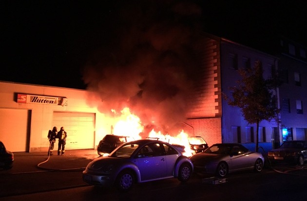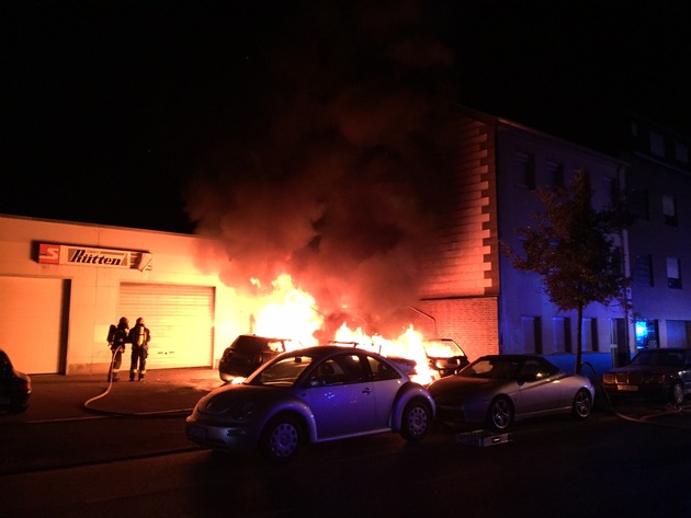 Im Einsatz waren der Löschzug der Feuer- und Rettungswache II, das Hilfeleistungslöschfahrzeug der Feuer- und Rettungswache III, die Einheit Stadtmitte der Freiwilligen Feuerwehr, ein Notarzteinsatzfahrzeug, ein Rettungswagen, der Führungsdienst aus dem Führungs-und Lagezentrum und der Abrollbehälter Sonderlöschmittel aus dem Technik- und Logistikzentrum. In der Nacht meldeten Anwohner Feuerschein auf der Brunnenstr. Die Leitstelle alarmierte die zuständigen Einsatzkräfte. Beim Eintreffen alarmierte der Führungsdienst aufgrund des starken Brandereignisses weitere Kräfte zur Einsatzstelle. Es brannten vier PKW vor einer Werkstatt. Diese wurden mit zwei C- Rohren und Pulverfeuerlöschern von zwei Atemschutztrupps im Außenangriff gelöscht. Zwei weitere Trupps durchsuchten das angrenzende Nachbargebäude und die Werkstatt nach Brandnestern. Das Nachbargebäude stand zum Zeitpunkt des Brandereignisses leer. Ein Trupp untersuchte die angrenzende wärmegedämmte Fassadenwand mit der Drheleiter nach Glutnestern. Das Feuer wurde dank des massivem Löscheinsatz schnell unter Kontrolle gebracht und ein Übergreifen auf weitere Fahrzeuge und angrenzende Gebäude konnte somit verhindert werden.