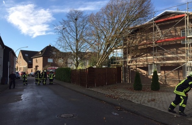 In Beckrath auf der Straße "Am End" stürzte aufgrund des starken Windes ein ca. 10 m hoher Baum auf das Dach eines Einfamilienhauses. Er blieb an einem am Haus angebrachten Gerüst hängen und drohte weiter auf den Gehweg und die Straße zu stürzen. Personen kamen keine zu Schaden.