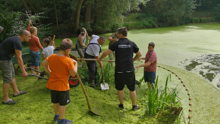 Seit den Mittagsstunden kämpfen Feuerwehr und der Angelverein Mönchengladbach-Rheydt 1935 e.V. gemeinsam gegen ein akutes Fischsterben in den Vereinsgewässern in Peel. Dort hatte sich der Sauerstoffgehalt des Wassers durch eine schlagartige Vermehrung von Wasseralgen so rapide gesenkt, dass bereits am frühen Samstag tote Fische auf dem Wasser trieben. Als die ersten Einsatzkräfte an dem See eintrafen zeigten sich ungewöhnlich viele Fische an der Wasseroberfläche. Die Feuerwehr setzt zur Zeit mehrere Pumpen ein um das Wasser umzusetzten und zu belüften. Gemeinsam mit den Mitgliedern des Angelvereins werden die Algen aus dem Wasser geschaufelt, um die Wasseroberfläche wieder durchgängig zu machen.
