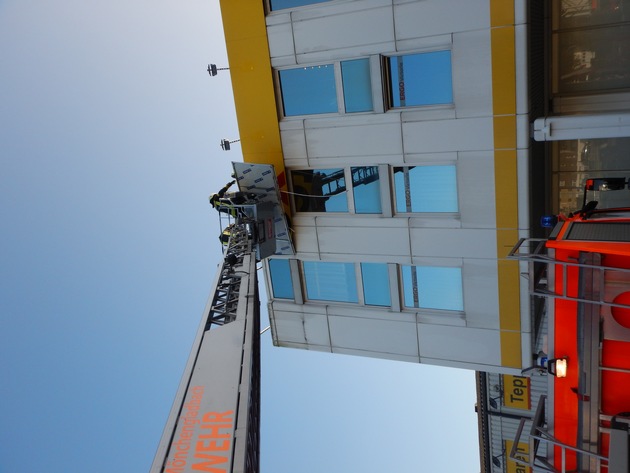 Am heutigen Montagmorgen wurde die Feuerwehr Mönchengladbach von einem besorgten Geschäftsführer zu einem Geschäftshaus an die Feldstraße im Ortsteil Schmölderpark alarmiert. Eine ca. 3m² große Werbetafel aus Alu-Verbundmaterial war vermutlich aufgrund des am Vortag vorbeigezogenen Sturmtiefs Herwart teilweise aus ihrer Verankerung gerissen worden und drohte nun aus ca. 15m Höhe auf den darunterliegenden Kundenparkplatz abzustürzen. Die Feuerwehr sperrte den Gefahrenbereich ab und sicherte die Tafel mit Leinen. Im Anschluss wurde das Werbeschild mit einem Trennschleifer von den Resten der noch intakten Halterung getrennt und sicher zu Boden geführt. Der Einsatz für die 10 Einsatzkräfte war nach einer knappen Stunde beendet.