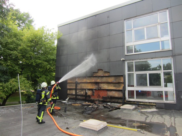 Heute(01.08.2015 um 16:23 Uhr)wurde die Feuerwehr Mülheim zu einem Gebäudebrand an der Saarner Kuppe alarmiert. Aus bisher ungeklärter Ursache brannten Teile eines Flachdaches und die angrenzende Fassade. Der Brand konnte durch die Feuerwehr schnell bekämpft werden.Von den zwei alarmiereten Löschzügen (Heissen und Broich) konnten einige Fahrzeuge die Einsatzstelle nach kurzer Zeit bereits wieder verlassen. Im Zuge der Brandbekämpfung mussten Teile der Fassadenverkleidung entfernt werden. Verletzte/Beteiligte gabe es nicht. Am Gebäude entstand erheblicher Sachschaden. Die Kriminalpolizei hat die Ermittlungen zur Brandursache aufgenommen.