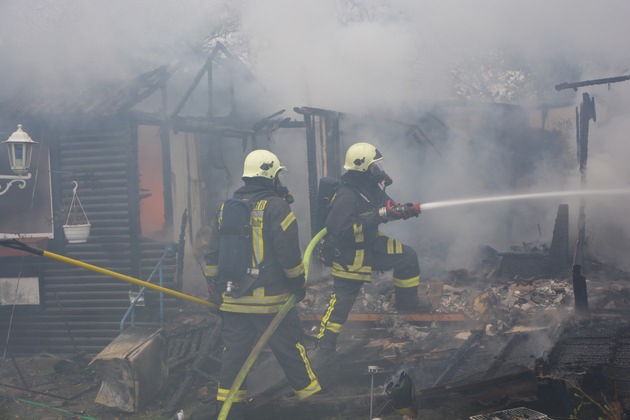 Am Sonntagmittag kam es um 14.00 Uhr in einer Kleingartenanlage an der Burgstraße in Mülheim-Styrum zu einem Laubenbrand mit starker Rauchentwicklung. Schon auf der Anfahrt zur Einsatzstelle war starke Rauchentwicklung zu erkennen. Bei Eintreffen der Einsatzkräfte stand die zirka 50 Quadratmeter große Gartenlaube in Vollbrand. Bei Ausbruch des Feuers befand sich eine männliche Person in der Laube. Mit leichten Brandverletzungen konnte er sich selbstständig ins Freie retten und wurde vom Rettungsdienstpersonal behandelt. Nach Aussagen des Bewohners befanden sich noch mehrere Campinggasflaschen im Gebäude. Um einen sogenannten Druckgefäßzerknall zu verhindern wurden die Gasflaschen massiv mit Wasser gekühlt. Durch die Polizei wurde das angrenzende Wassermuseum "Aquarius" vorsorglich geräumt. Das Feuer war nach zirka einer Stunde gelöscht. Die Nachlöscharbeiten dauerten noch eine weitere halbe Stunde. Nach Abschluss der Löscharbeiten wurde die Einsatzstelle den Brandursachenermittlern der Kriminalpolizei übergeben. (TDr)