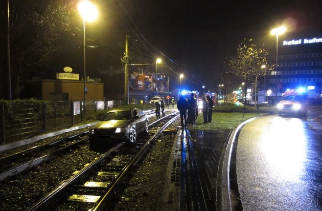 FW-MH: Glüch im Unglück! Personenkraftwagen landet im Straßenbahngleisbett