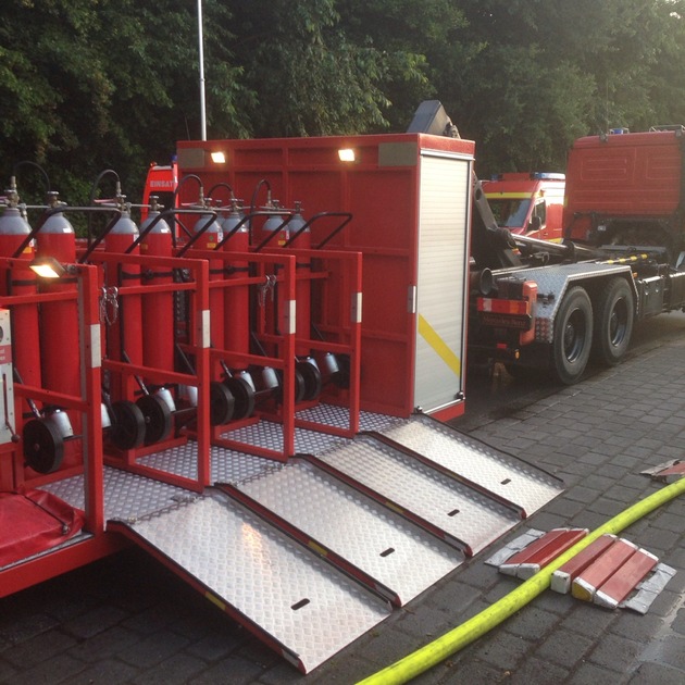Um 3 Uhr in der Früh erreichte ein Hilfeersuchen aus dem Rheinisch-Bergischen-Kreis, die Leitstelle der Feuerwehr Mülheim. Im rheinischen Leichlingen war es am Vorabend zu einem Brand in einem Spänebunker eines holzverarbeitenden Betriebes gekommen. Eine Brandbekämpfung mit Wasser ist in einem Silo nicht möglich. Das Brandgut würde sich mit Wasser vollsaugen, quellfähige Stoffe wie Getreide würden aufquellen und dadurch die Statik des Gebäudes gefährden. Daraufhin forderte die örtliche Einsatzleitung das Sonderlöschmittel Kohlenstoffdioxid (CO2) an. Ein Wechselladerfahrzeug mit dem Abrollbehälter Sonderlöschmittel, bestückt mit 640 kg CO2, wurde umgehend nach Leichlingen entsandt. Die Feuerwehren aus Düsseldorf, Duisburg und umliegende Werkfeuerwehren lieferten ebenfalls große Mengen Kohlenstoffdioxid an die Einsatzstelle. Nachdem der Brand mit CO2 erstickt ist wird das Brandgut aufwendig aus dem Silo entfernt, um auch die letzten kleineren Brandnester aufzuspüren und ablöschen zu können. Dieser Einsatz wird sich für die Leichlinger Brandschützer voraussichtlich noch bis in den späten Mittwochabend erstrecken. Die Mülheimer Einsatzkräfte kehrten um 8 Uhr wieder in das heimische Stadtgebiet zurück.