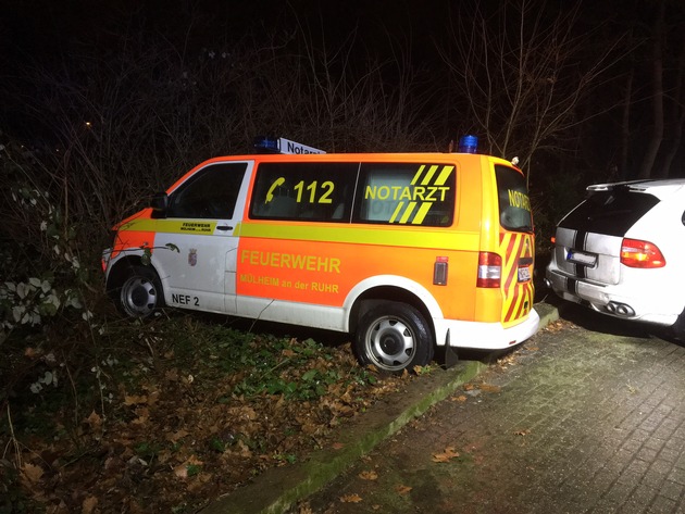 FW-MH: Heftiges Glatteis. Auch Notarzteinsatzfahrzeug rutscht in ein Gebüsch.