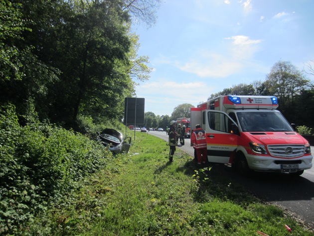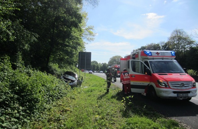 Hier war aus ungeklärter Ursache ein PKW mit zwei Insassen nach rechts von der Fahrbahn abgekommen. Dabei fuhr er eine Böschung hinauf, prallte gegen einen Baum und rutschte die Böschung wieder hinab. Die beiden verletzten Insassen wurden sofort notärztlich versorgt und in ein Mülheimer Krankenhaus transportiert. Die Feuerwehr sperrte die rechte Fahrspur und stellte den Brandschutz sicher.