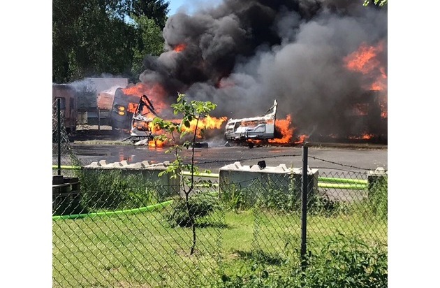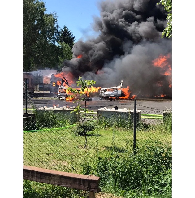 Am heutigen Freitag erreichten mehrere Notrufe die Leitstelle der Feuerwehr. An der Kölner Straße brannte ein Wohnwagen. Eine große schwarze Rauchwolke deutete auf einen größeren Einsatz hin. Beim Eintreffen der Einsatzkräfte hatte sich der Brand auf 15 Wohnwagen ausgebreitet. Während der Löscharbeiten explodierten 20 in den Wohnwagen befindliche Gasflaschen. Das Feuer wurde mit massiven Wasser- und Löschschaumeinsatz bekämpft. Immer wieder explodierende Gasflaschen stellten hier eine besondere Gefahr dar. Ein Übergreifen des Brandes auf ein unmittelbar angrenzendes Gasflaschenlager mit weiteren 100 Gasflaschen konnte durch eine so genannte Riegelstellung verhindert werden. Die Berufsfeuerwehr war mit zwei Löschzügen und mehreren Sonderfahrzeugen im Einsatz. Unterstütz wurden sie durch den Löschzug Heißen der Freiwilligen Feuerwehr. Während des zirka zwei stündigen Einsatzes war die Kölner Straße komplett gesperrt. Die Polizei hat die Untersuchungen zur Brandursache aufgenommen.