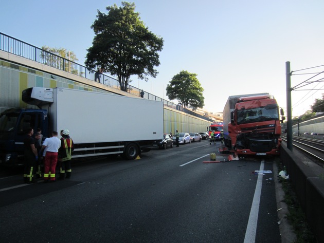 Die Leitstelle der Berufsfeuerwehr entsendete umgehend einen Rüstzug, zwei Rettungswagen sowie ein Notarzteinsatzfahrzeug zur Unfallstelle. Der Unfall ereignete sich ca. 100 m hinter der Anschlussstelle Essen-Frohnhausen. Aus bisher ungeklärten Umständen war dabei ein Lkw auf einen anderen LKW aufgefahren. Das Fahrerhaus des auffahrenden LKW wurde dabei stark eingedrückt. Der zweite LKW wurde durch die Wucht des Aufpralls gegen die rechte Begrenzungsmauer gedrückt. Die beiden Fahrer konnten sich selbst aus ihren Fahrzeugen befreien. Beide Fahrer waren verletzt und wurden nach rettungsdienstlicher Behandlung mit Rettungswagen in umliegende Krankenhäuser transportiert. Für die Zeit des Einsatzes war die A40 in Fahrtrichtung Essen gesperrt.