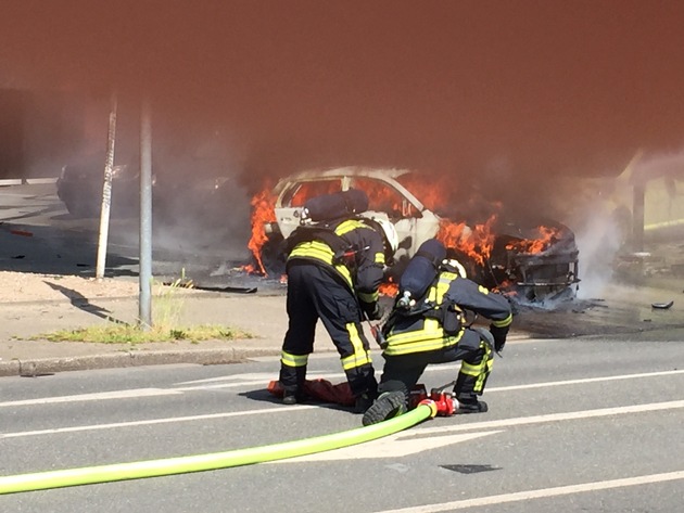 Beim Eintreffen der Feuerwehr stand ein PKW vor einem Autohaus in Vollbrand. Eine verletzte Person wurde gerade von Passanten in einen sicheren Bereich gebracht.