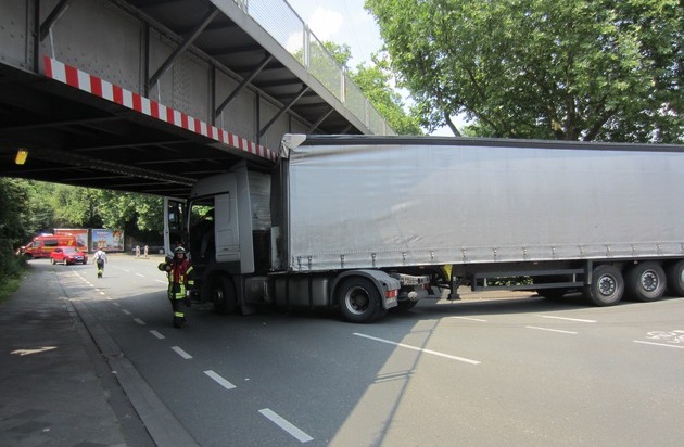 Am heutigen Dienstagnachmittag wurde die Feuerwehr Mülheim an der Ruhr gegen 14 Uhr zu einer Brücke an der Sandstraße alarmiert. Dort hatte sich ein ausländischer LKW mit Sattelauflieger unter einer Brücke verkeilt. Die Feuerwehr sperrte die Sandstraße in beiden Richtungen, überprüfte den LKW auf auslaufende Betriebsmittel und informierte die für die Brücke zuständige Firma, damit das Bauwerk bautechnisch überprüft wird. Die Einsatzstelle konnte nach ca. 45 Minuten der Polizei übergeben werden. (VHa)