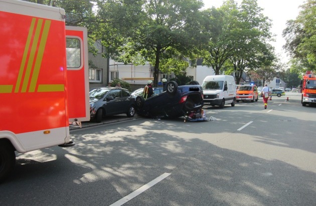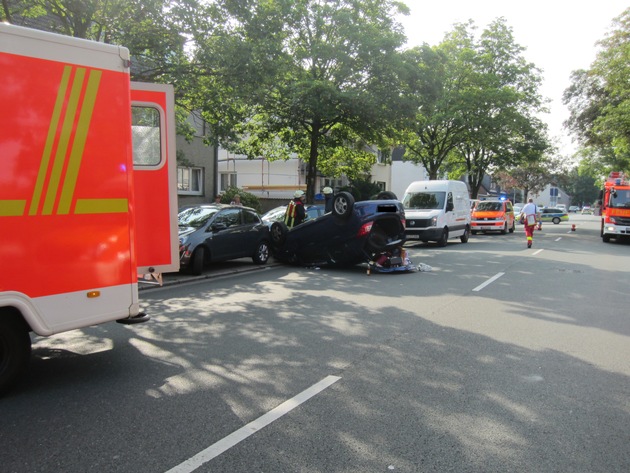 Hier war, aus bisher ungeklärter Ursache, ein Pkw mit zwei Insassen mit einem geparkten Fahrzeug kollidiert. Durch die Wucht des Aufpralls überschlug sich das Unfallfahrzeug und blieb auf dem Dach liegen. Bei Eintreffen der Feuerwehr Mülheim, hatten beide Insassen bereits das Unfallfahrzeug verlassen und wurden durch Ersthelfer betreut und versorgt. Die weitere rettungsdienstliche Versorgung wurde durch den Notarzt und zwei Rettungswagen-Besatzungen übernommen.